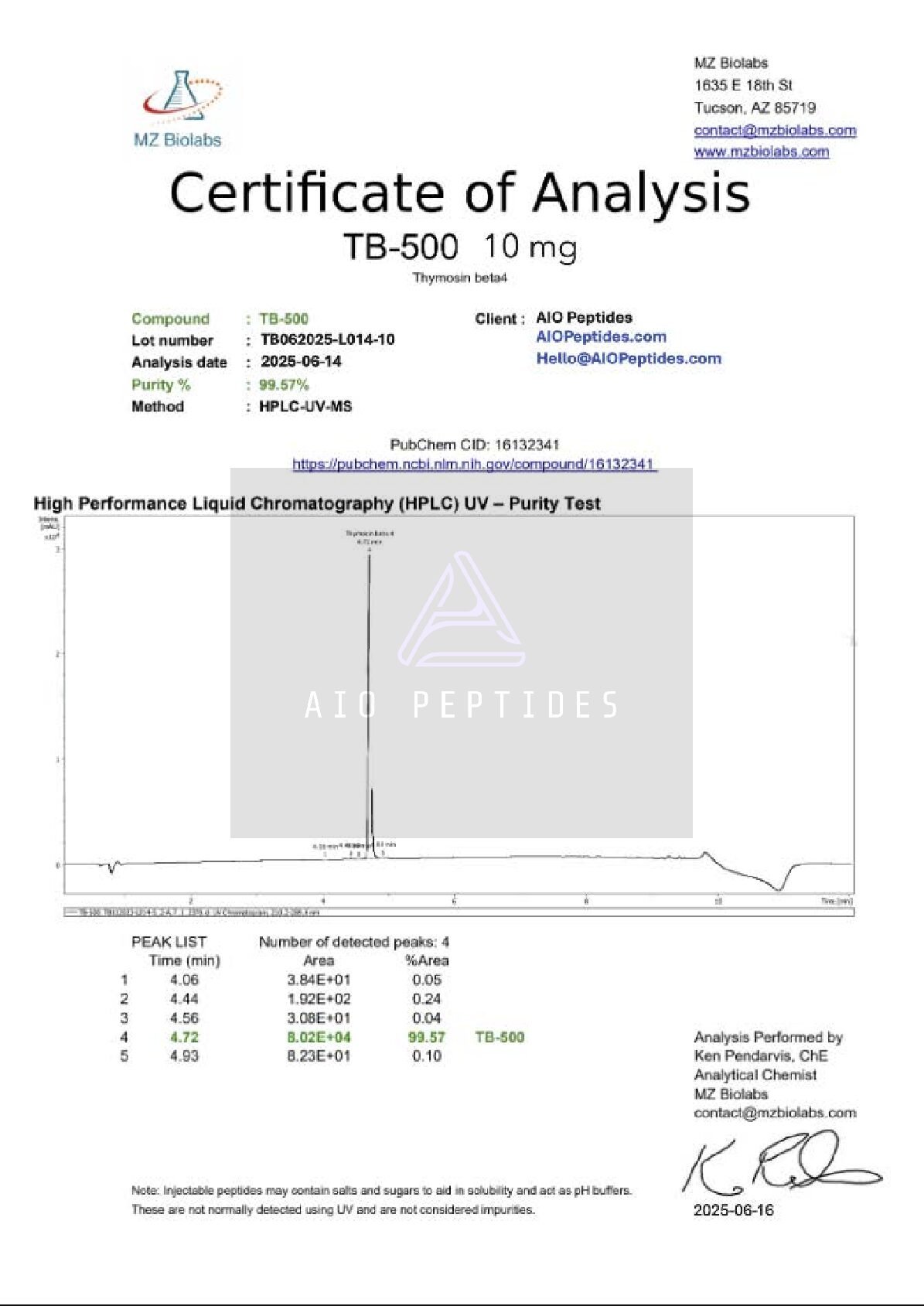 TB-500 is a synthetic version of a naturally occurring protein fragment called Thymosin Beta-4 (Tβ4), which is found in almost all human and animal cells. It plays a vital role in tissue repair, regeneration, and recovery. TB-500 is designed to replicate and enhance the healing functions of Tβ4.